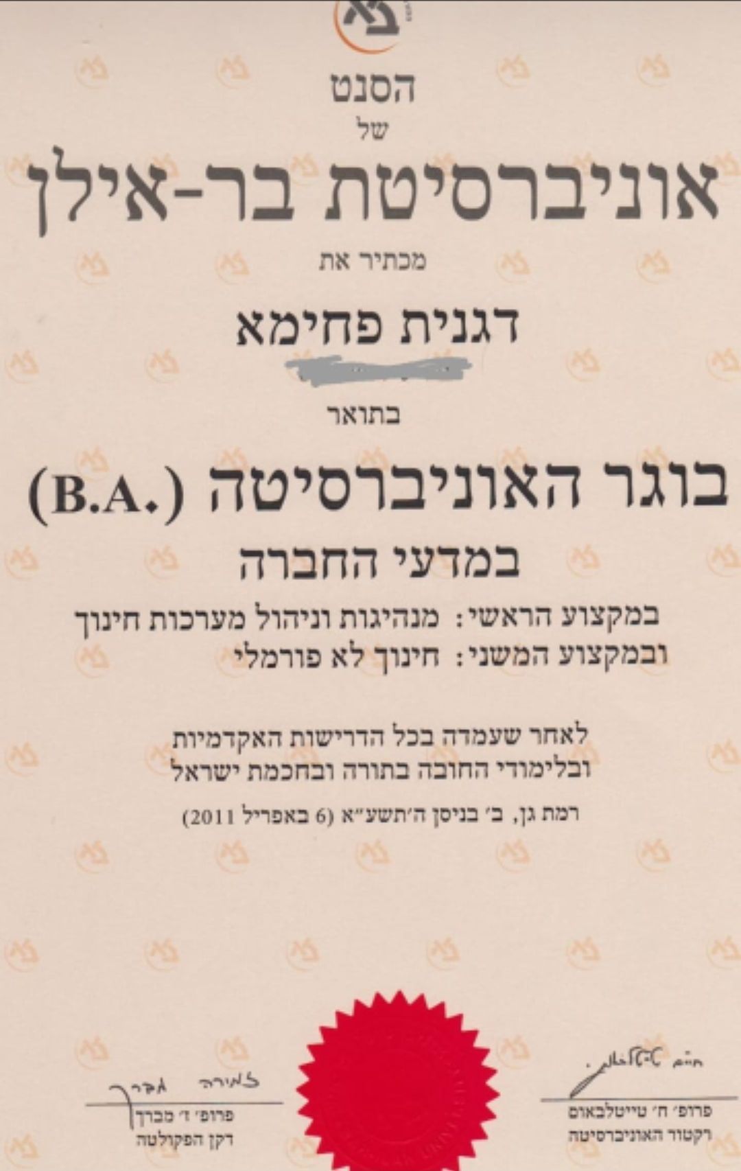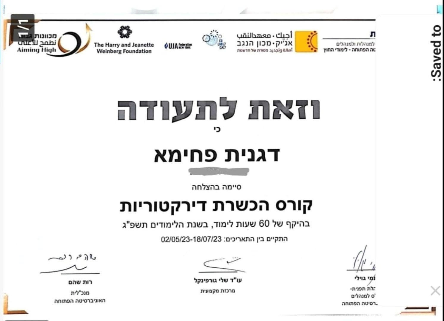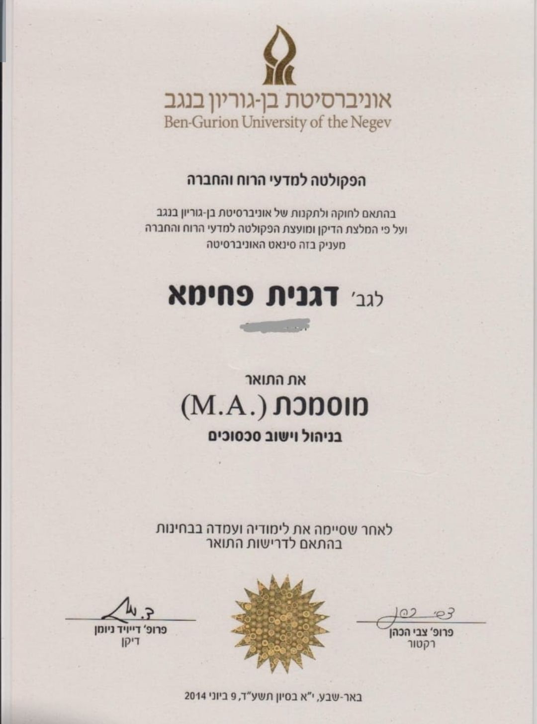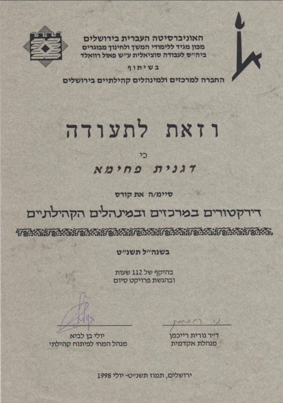 בוגרת תוכנית מעוז -עתודות לישראל, מקום מחזור א' בעלת תואר ראשון במינהל חינוכי אונ' בר אילן, תואר שני בניהול וישוב סכסוכים אונ' בן גוריון, מוסמכת בגישור אינטגרטיבי, עם מומחיות לניהול ויישוב סכסוכים וקונפליקטים במגוון תחומים.